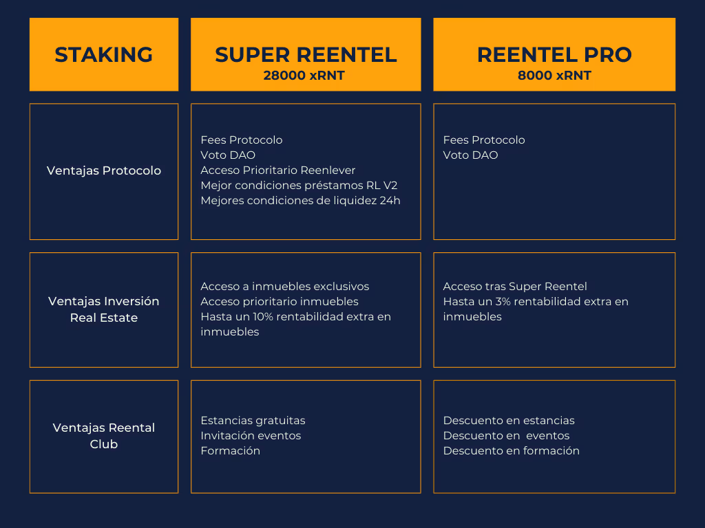 El staking de RNT en Reental ofrece una serie de beneficios significativos. Al stakear RNT, accederás a diferentes jerarquía de la plataforma, accediendo tiers con beneficios exclusivos, como aumento de rentabilidades en proyectos inmobiliarios y acceso prioritario a nuevos servicios como la pronta colateralización de tus token inmobiliarios. Además, los tokens xRNT obtenidos a través del staking permitirá participar y votar en la DAO de Reental, influyendo en decisiones clave del proyecto.